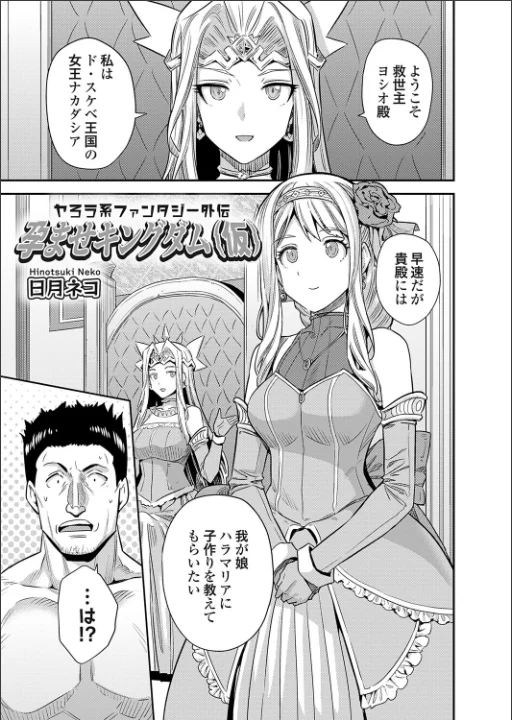 孕ませ職人・日月ネコのボテ腹ファンタジー外伝が登場!!子作りを忘れてしまった世界の種付け指南読切!AV男優のヨシオは戸惑っていた。というのもAV撮影中に突然異世界に転移させられ、ド・スケベ王国の女王ナカダシアから「娘のハラマリアに子作りを教えてもらいたい」と懇願されたからだ。詳しく話を聞くと、かつてこの世界にはベニスという魔王がおり国王を含めた義勇軍がその命をかけ仕留めたものの、散り際に人類を滅ぼすため「子作り」の方法を忘れる呪いをかけたという。その日以来、誰も新たに子を作ることができず、このままでは魔王の目論見通り人類が滅亡してしまうので、ド・スケベ王家の魔法「召喚術」により呪いの影響を受けていない異世界人のヨシオが召喚されたという事であった。何より王家の血を絶やす訳にはいかず、王女ハラマリアもすでに子作りを行う心持ちになっていた。ヨシオは困惑しつつも子作りが尊い儀式に違いないと信じるハラマリアの豊かな胸を見て、あっさり状況を受け入れ、彼女に今すぐ全裸になれと要求する。近衛が動揺し、ナカダシアも「本当にそれが子作りと関係あるのか」とヨシオを睨みつけるが、ハラマリアを抱くためにかましたヨシオは一歩も引かず近衛達の前でハラマリアを脱がせる事に成功する。「本当にこれで赤子を授かれるのか…」ハラマリアは疑問に思うが彼女の気持ちを察したヨシオは即「子作りは男と女が身体を重ね合わせる事で行われる…具体的にはここ!」と再びかまし、ハラマリアのアソコを指で開き近衛に見せつけるのだった。戸惑うナカダシアや近衛の目の前で濃厚な子作り講義がいよいよ行われる。頭が高い!俺だけが女の孕ませ方を知っているんだが?