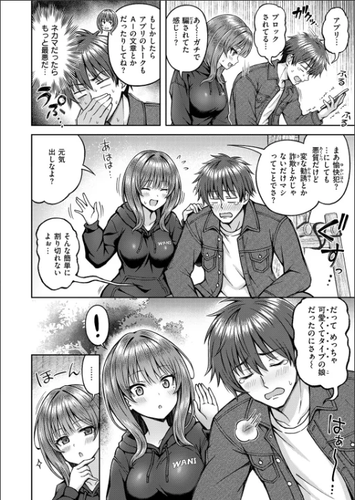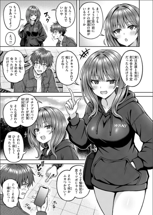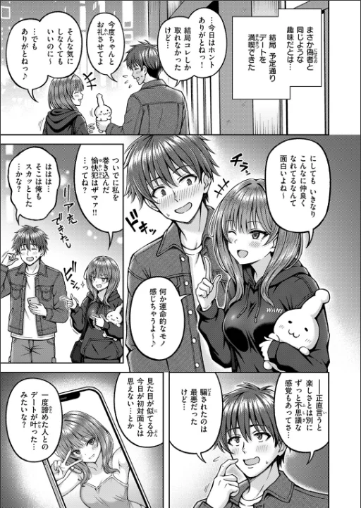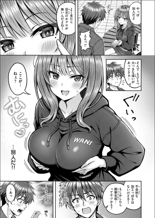 「スケベ同志 最後の相性確認しちゃおっか♪」マチアプで知り合った「アイさん」とのデート当日。待ち合わせ場所にいたのは、写真そっくりだけど胸のサイズが全く違うマミさんだった。アイさんの正体がディープフェイクを使った悪戯だと分かり落ち込む主人公。だけどマミの方もちょうど予定をドタキャンされたらしく、そのまま彼女とデートすることに。見知らぬ相手で不安だったものの、偶然にも趣味がぴったり合って意気投合した2人は、そのまま生身じゃないと分からない相性を確かめることに……♪