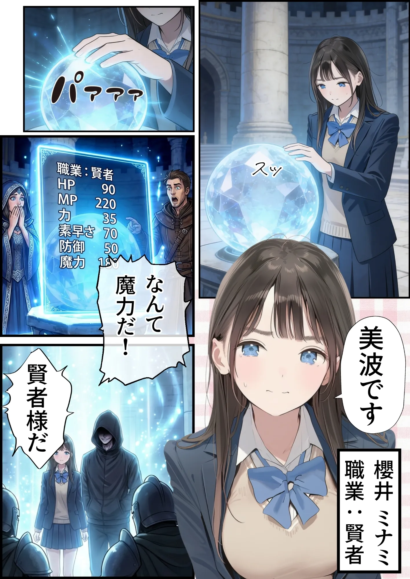 水晶に手を触れると、職業とステータスが表示される。