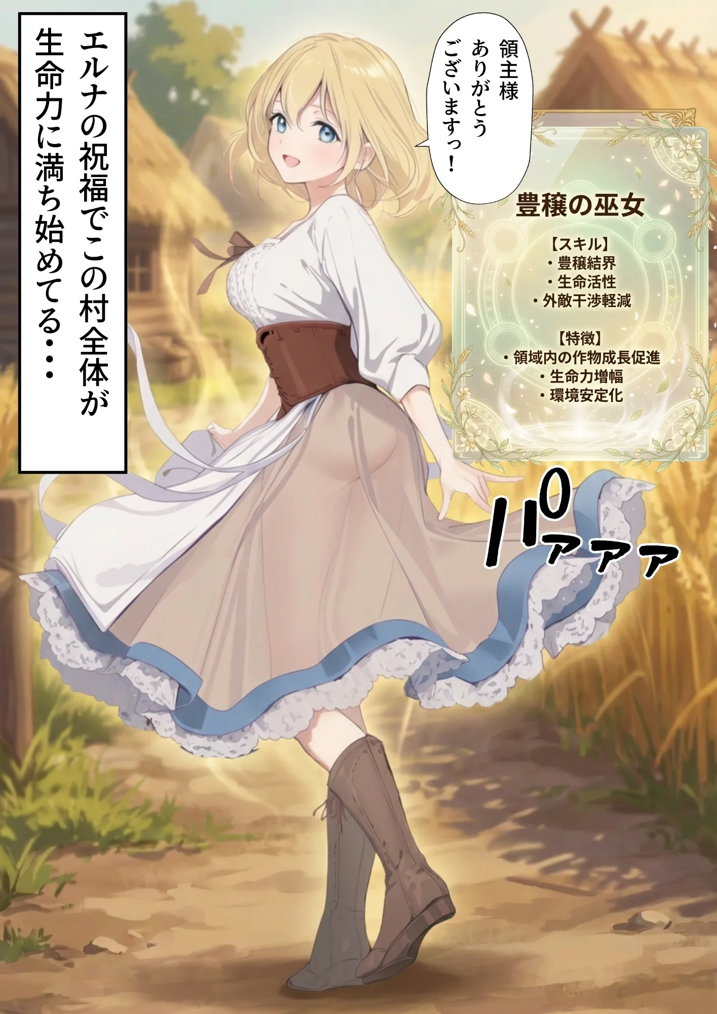 コルセットで締められた腰つき、素朴な村娘服から漂う無自覚な色気が魅力。