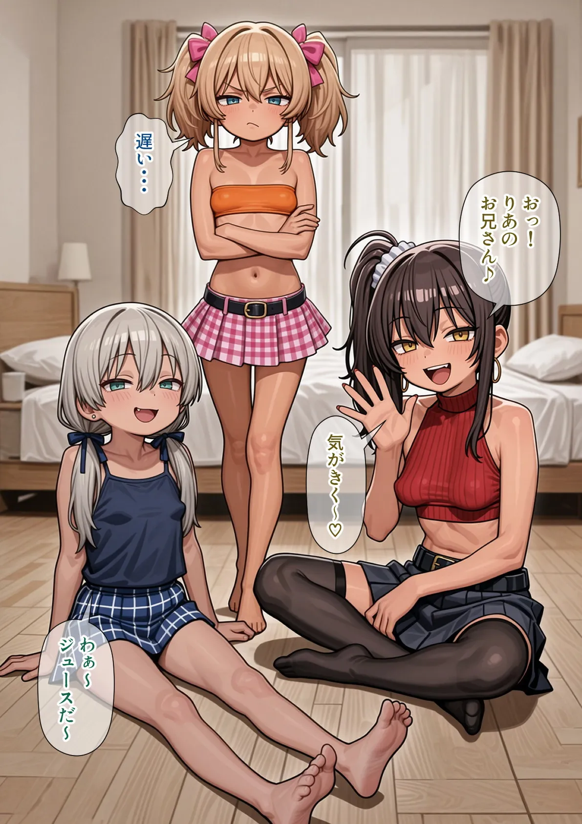 AIコミックなのに全然AIっぽさがないのがすごいんですよね。キャラの髪型や服装のブレがほとんどなくて、ビジュアルが超安定してる! ミニ系で日焼けギャルっぽいヒロインたちも可愛くてエロくて最高だし、特にツンデレ気味の妹ちゃんがメインヒロインなのがたまらない~!