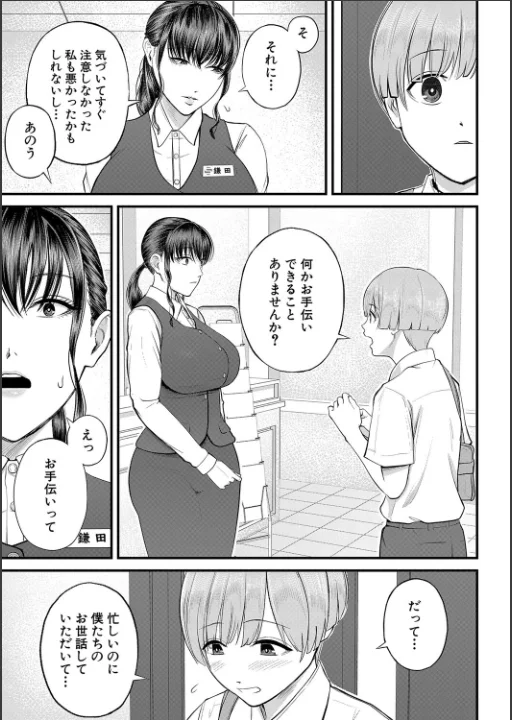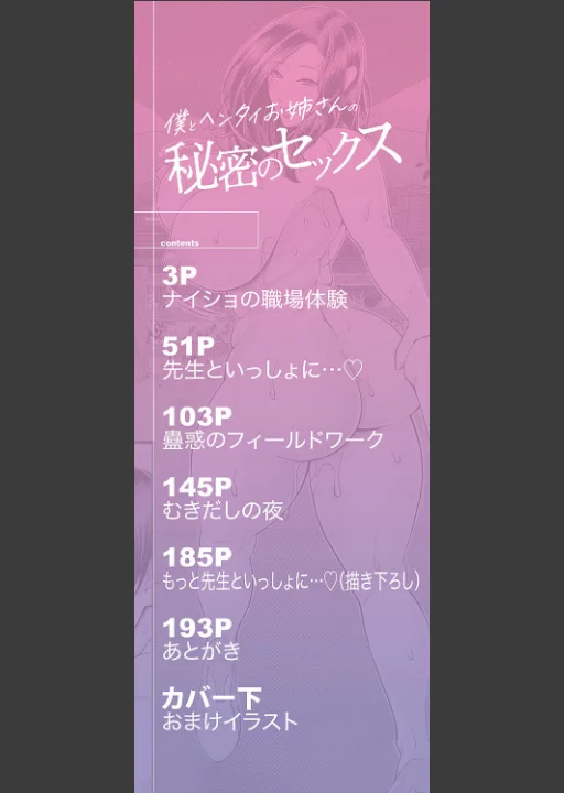 【第1話試し読み付き!!】むっちりとした大人のお姉さんが童貞の僕だけに見せるありのままの姿…印刷所で働く弘美は、職場体験に来た男子学生たちの面倒を任されることになる。学生の一人・つとむが仕事を押し付けられている様を見た彼女が同級生らを注意したその夜、つとむはお礼として多忙の弘美の為に恩返しをしようとする。仕方なしに肩もみをお願いするも、思春期の男の子のエロい目線と、日々の欲求不満が重なり、事態はどんどんエロい方向に…(「ナイショの職場体験」より)【収録作品】1 ナイショの職場体験2 先生といっしょに…◇3 蠱惑のフィールドワーク4 むきだしの夜5 もっと先生といっしょに…◇(描き下ろし)6 あとがき7 おまけイラスト【FANZA限定特典!!】表紙線画と複製原画データ【通常特典】メッセージペーパーSNSで公開した、描き下ろしイラスト2点