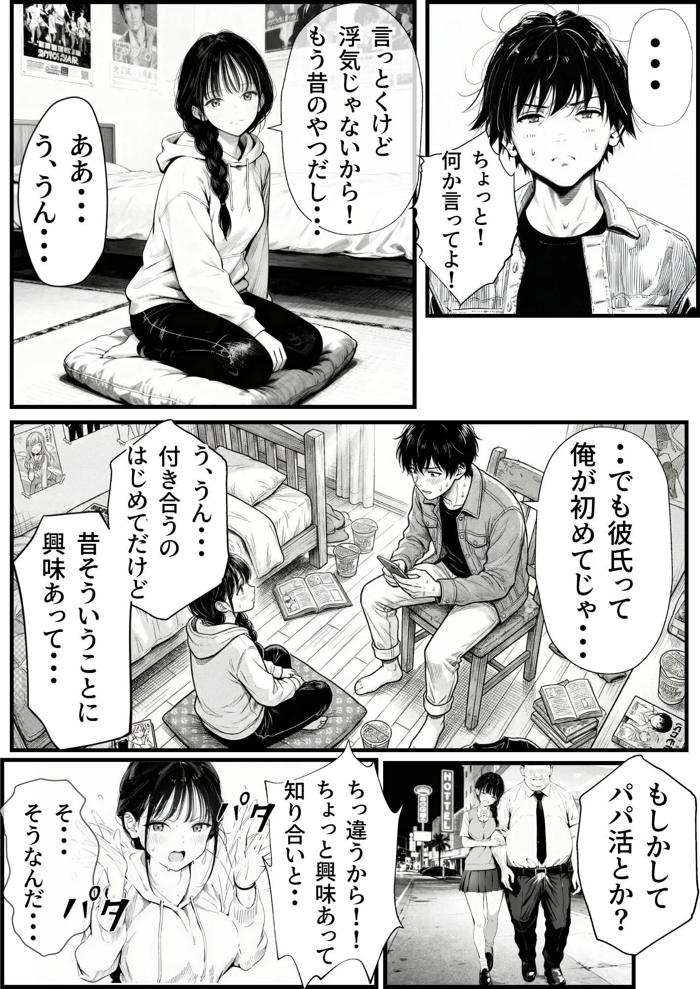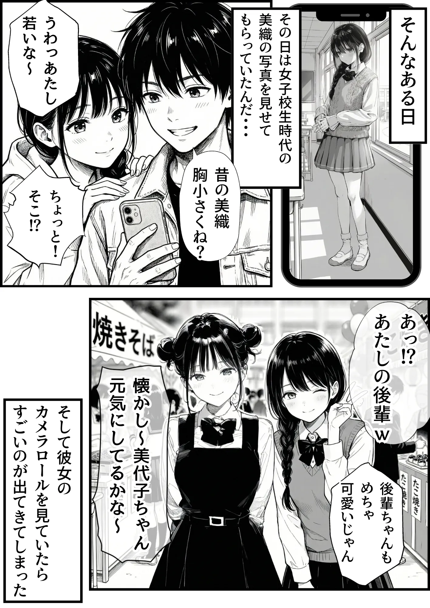 AIイラストの特性上、矛盾した場面(服装や髪型・体型など)はありますが、